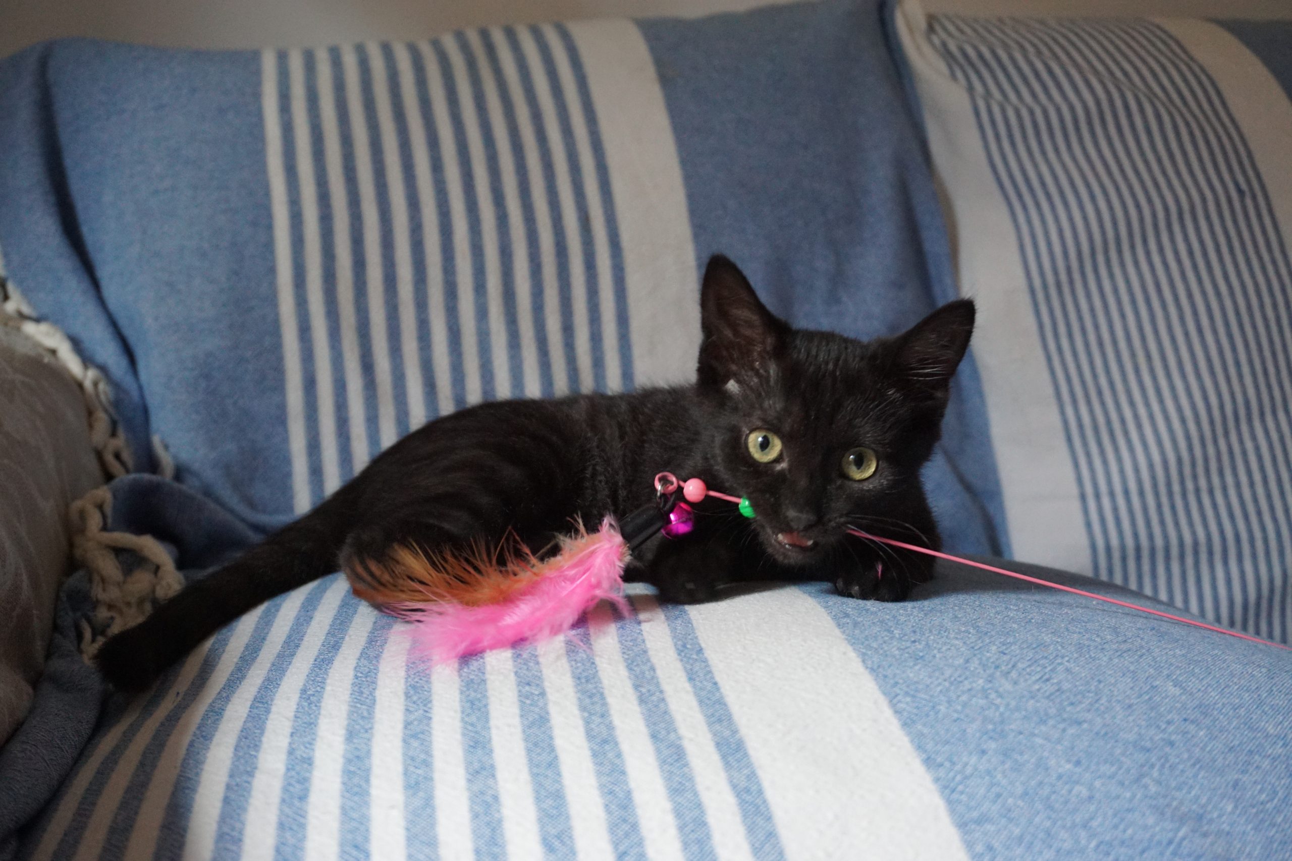 Es la más valiente de sus cinco hermanos, que fueron rescatados de un pajar. Siempre explorando cada rincón y convirtiendo cualquier objeto absurdo en el mejor de sus juguetes 😹. Le encanta divertirse con sus hermanos, y por eso lo ideal sería que viviera con otro compañero joven para jugar y crecer feliz.