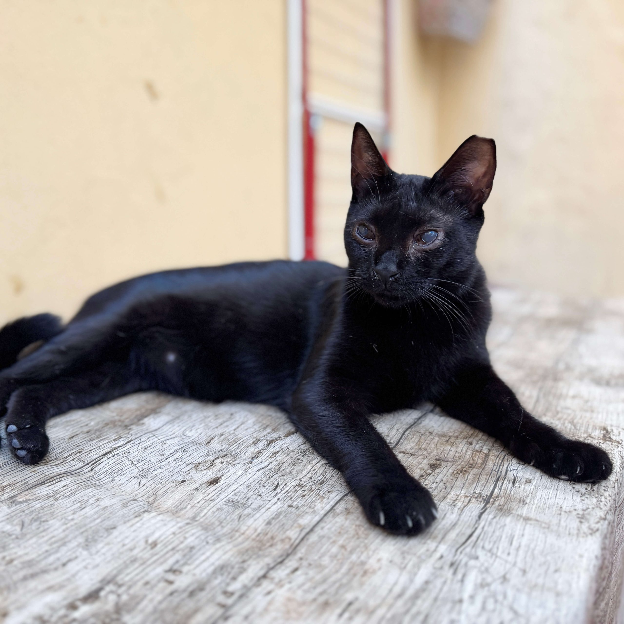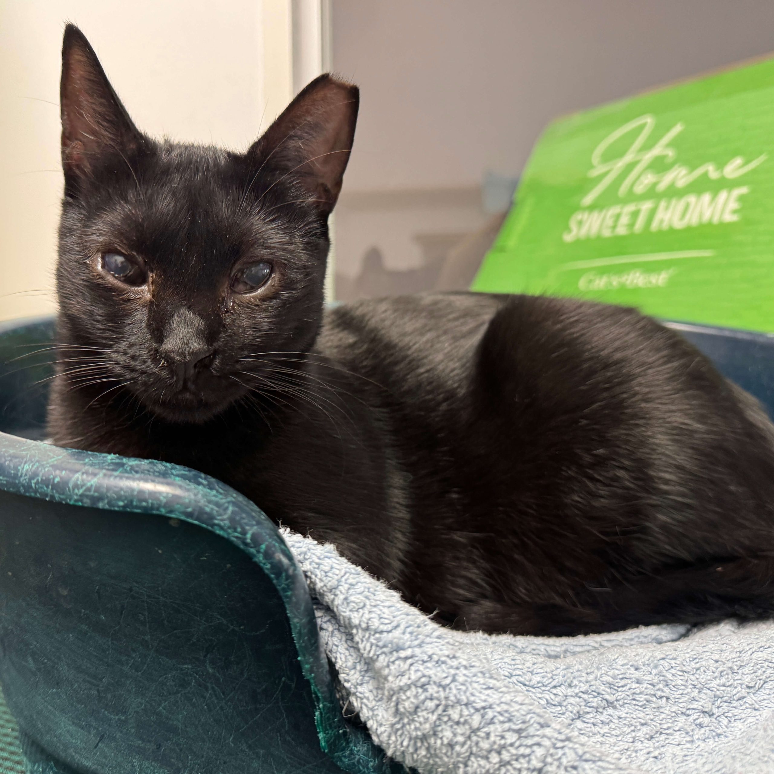 Li van diagnosticar una tercera parpella una mica fusionada que li provoca una petita obstrucció, i per això sempre té els ullets una mica plorosos… però hi veu perfectament, fa vida completament normal i no és contagiós. És només part del seu encant especial.
