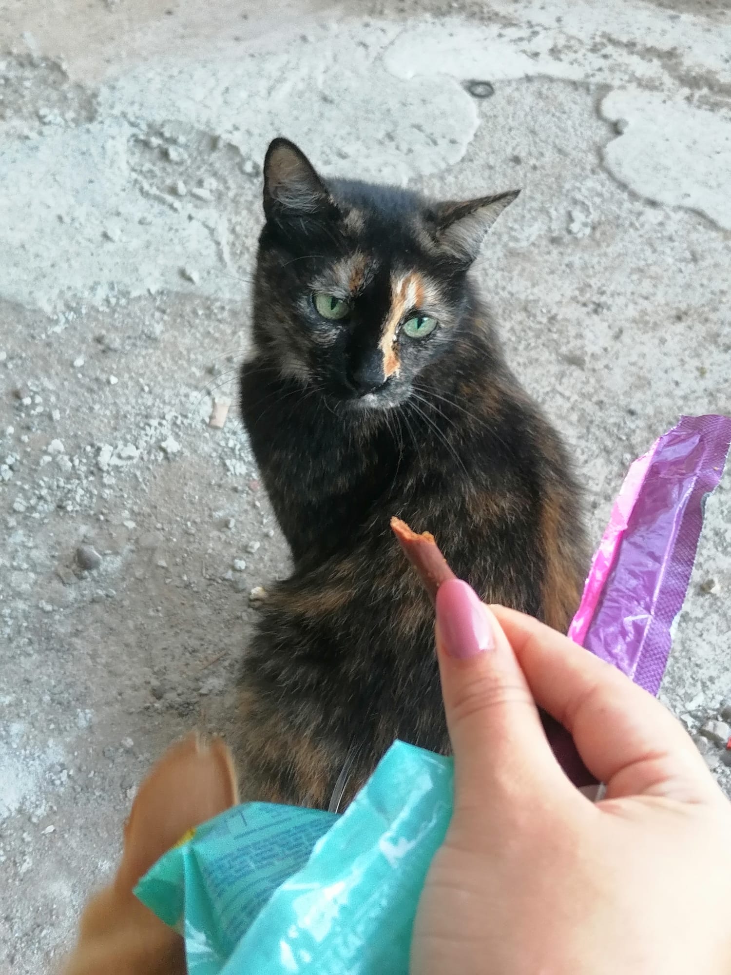 La Pola (gateta negra amb taques taronja) és tranquil·la, elegant i molt independent. Té una elegància que enamora… i si li dones les seves xuxes preferides fins i tot et deixarà passar la mà 😻.