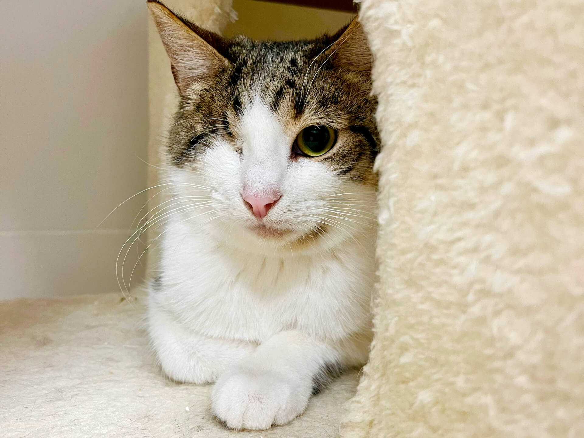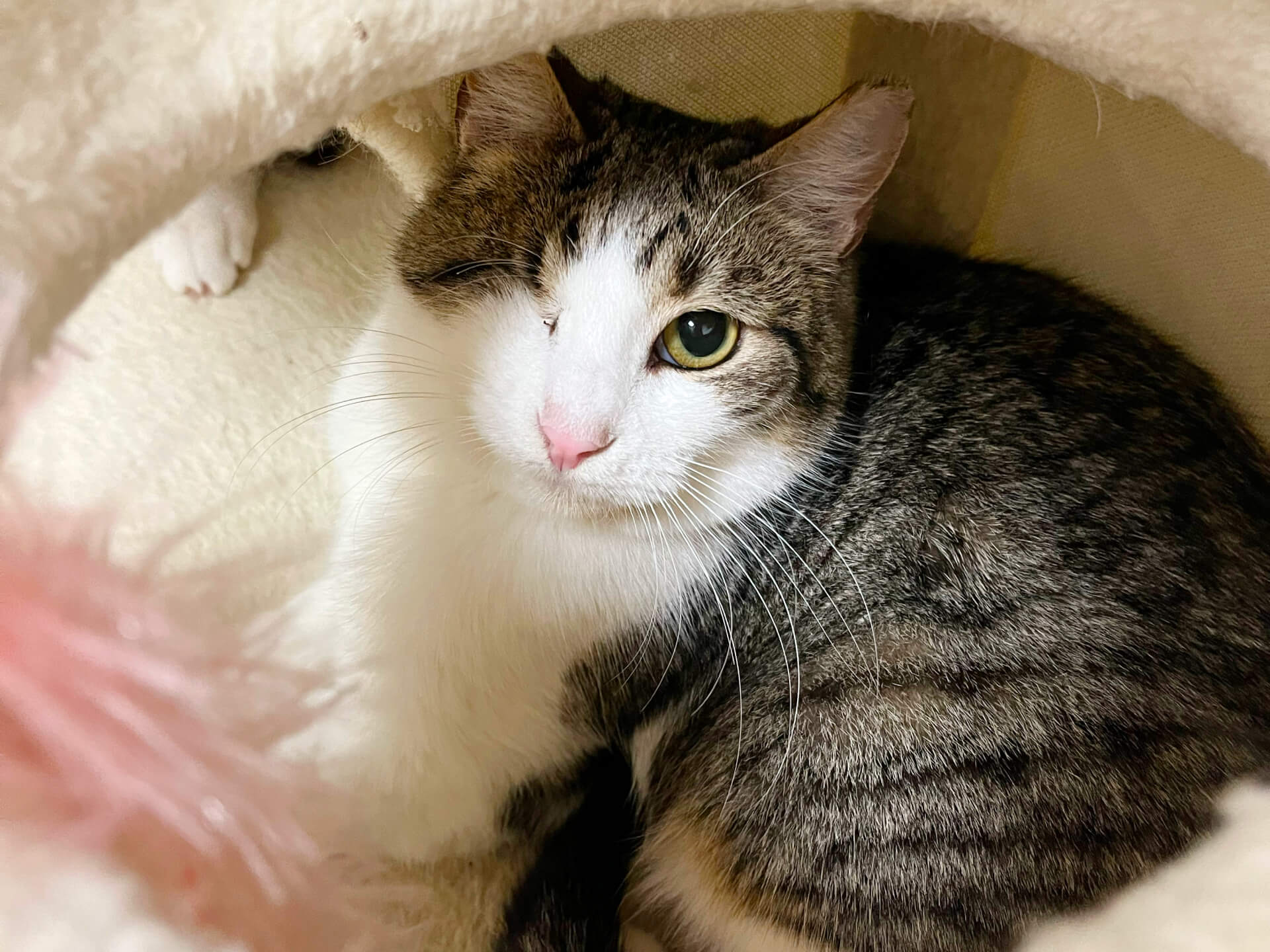 Sóc una gateta molt dolça i tranquil·la, només cal veure’m per enamorar-se de la meva carona. Encara que sóc una mica tímida amb les persones, poc a poc vaig guanyant confiança i m’encanta que m’acariciïn. Amb altres gats, sóc súper sociable! M’encanta jugar amb els meus companys d’habitació i gaudeixo molt de la seva companyia.