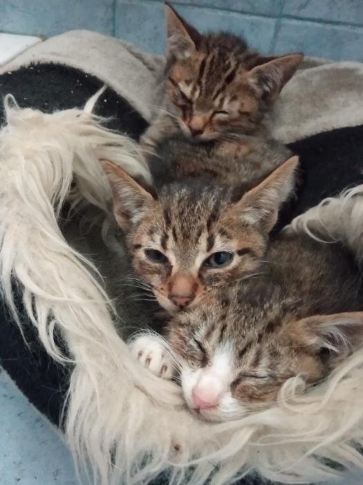 Som l’Anakin, el Luke i el Han. Vam ser rescatats quan estàvem molt malalts, molt constipats gairebé sense poder respirar. Per sort, ens van agafar a temps i vam anar a una casa calenteta on ens van cuidar, medicar i van evitar una mort segura al carrer amb la pluja i el fred. Ara estem recuperats i som uns entremaliats. Ens encanta jugar, el menjar humit i els carinyos. El Luke és el més tímid, però així i tot quan t’olora i es relaxa, ronca i busca carícies. Al Han li agrada el contacte humà, també al seu ritme, però és més atrevit que el Luke. El Han, quan troba una oportunitat, se’t puja a sobre per rebre carinyos. L’Anakin és el més confiat i afectuós, és un pèl mogut, com a bon cadell i és molt divertit. Busquem només adopció conjunta o amb una família on visqui un altre gat per poder jugar.